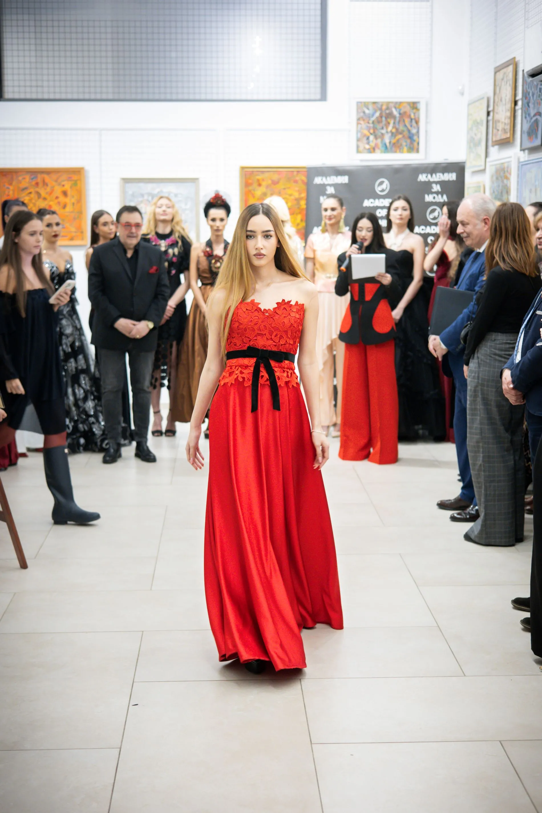 Модното ревю започна с Ивет Бианки – носител на „Изгряваща звезда 2025“ в категория „Международни успехи“ и носител на „Златна игла 2024“ в категория „Най-добър млад дизайнер“. Тя презентира рокля от последната си колекция – в дълбок, наситен червен цвят. Корсетната линия деликатно подчертава силуета, а черният колан с панделка акцентира талията и добавя драматичен контраст.