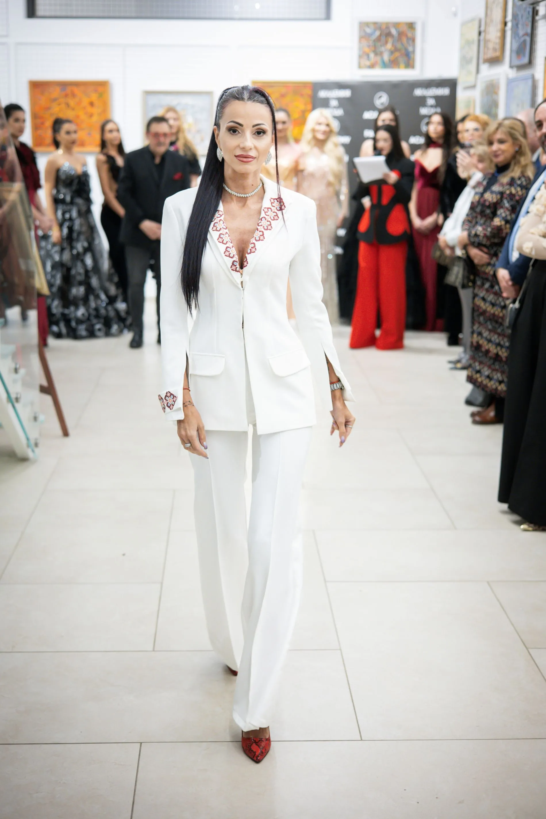 Модният бранд Kerana с дизайнер Ваня Паризова представи тоалет „Пазителка“, който представлява бял костюм с изчистена линия и автентична българска шевица, символ на сила, защита и родова памет. Аутфитът впечатлява с прецизна кройка и характерен акцент на гърба, вдъхновен от традиционните орнаменти, интерпретирани в модерна визия.