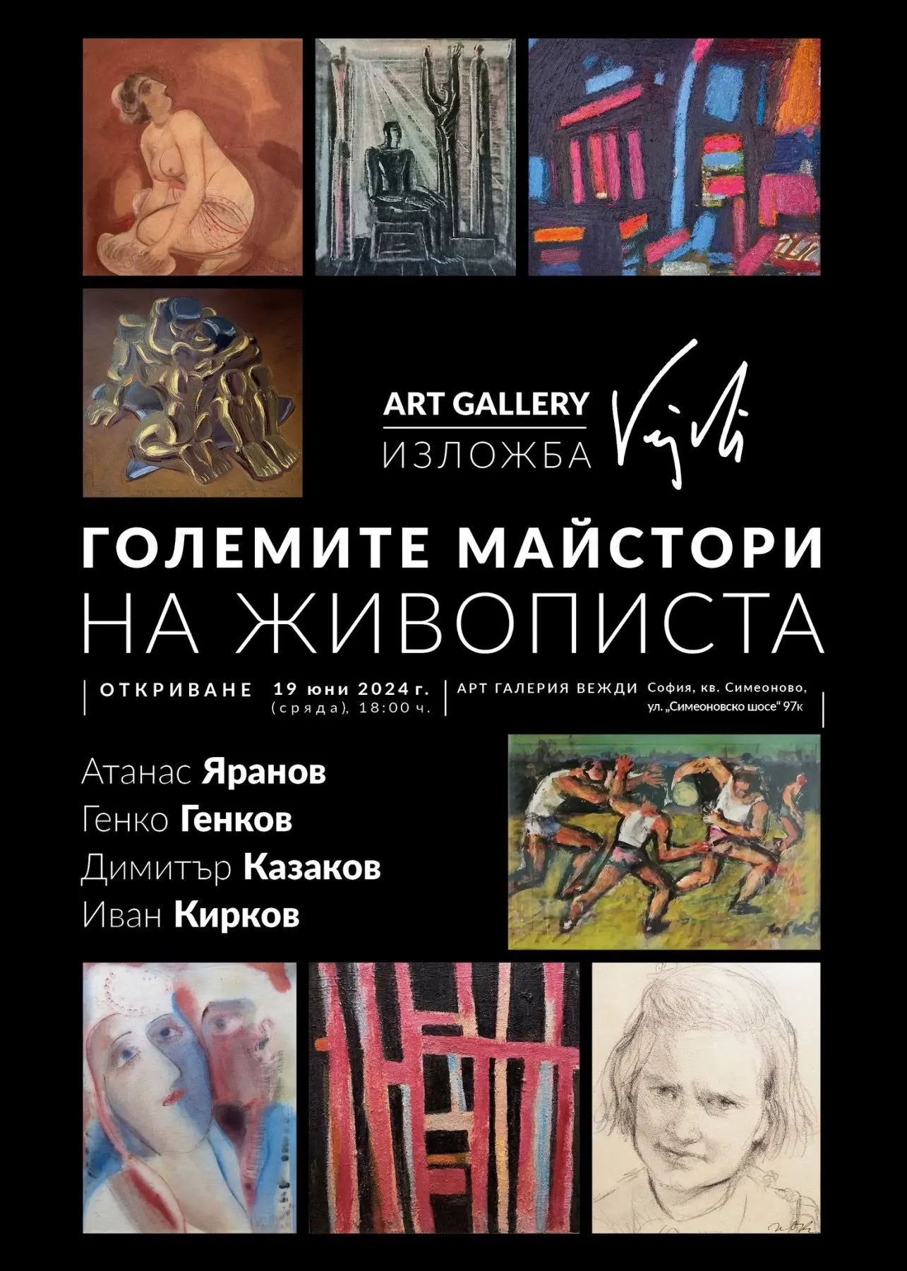 Арт галерия Vejdi представя специална експозиция с творби на майсторите на живописта Атанас Яранов, Генко Генков, Димитър Казаков и Иван Кирков. Изложбата се открива в сряда – 19 юни 2024 г. в 18:00 часа. Във вип арт пространството на столичната улица „Симеоновско шосе“ № 97 к ще бъдат подредени ценни творби на четиримата автори, които са сред най-големите имена в българската пластична култура.