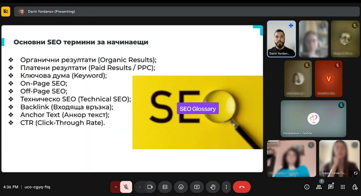 Първият модул от две лекции, воден от Дарин Йорданов (SEO специалист в Netpeak), въведе участниците в основите на оптимизацията за търсачки и ролята ѝ в рамките на комуникационната стратегия на всяка кауза. Акцентът бе върху това как чрез правилно структуриране на съдържанието, избор на ключови думи и техническа оптимизация, организациите могат значително да повишат видимостта на своите сайтове и инициативи.