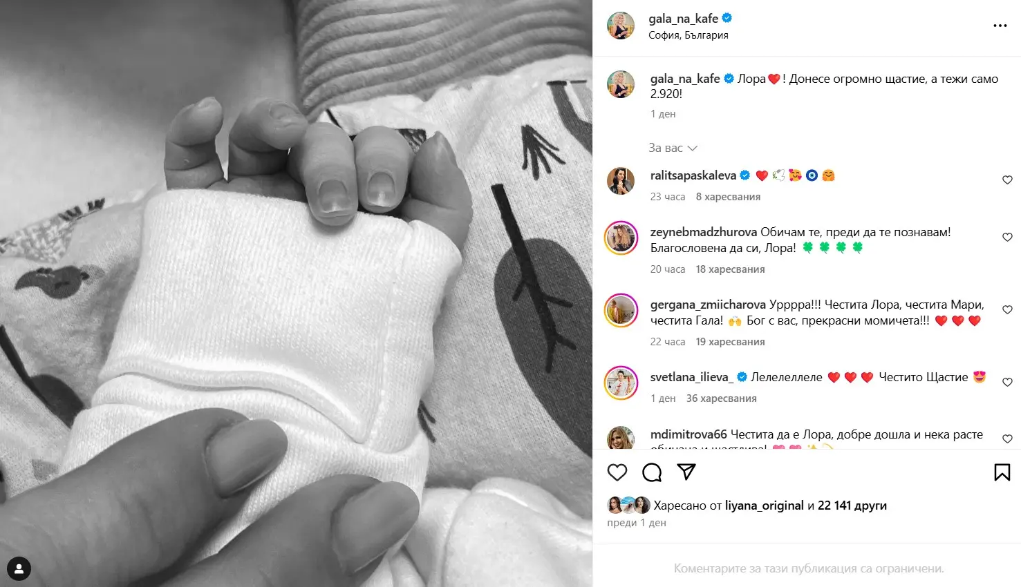 За водещата на „На кафе” това е първо внуче. „Лора! Донесе огромно щастие, а тежи само 2.920”, написа Гала.