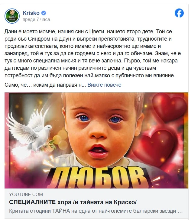 "Дани е моето момче, нашия син с Цвети, нашето второ дете. Той се роди със Синдром на Даун и въпреки препятствията, трудностите и предизвикателствата, които имаме и най-вероятно ще имаме и занапред, той е тук за да се гордеем с него и да го обичаме. Знам, че е тук с много специална мисия и тя вече започна. Първо, той ме накара да гледам по различен начин различните деца и да чувствам потребност да им бъда полезен най-малко с публичното ми влияние", написа Криско.