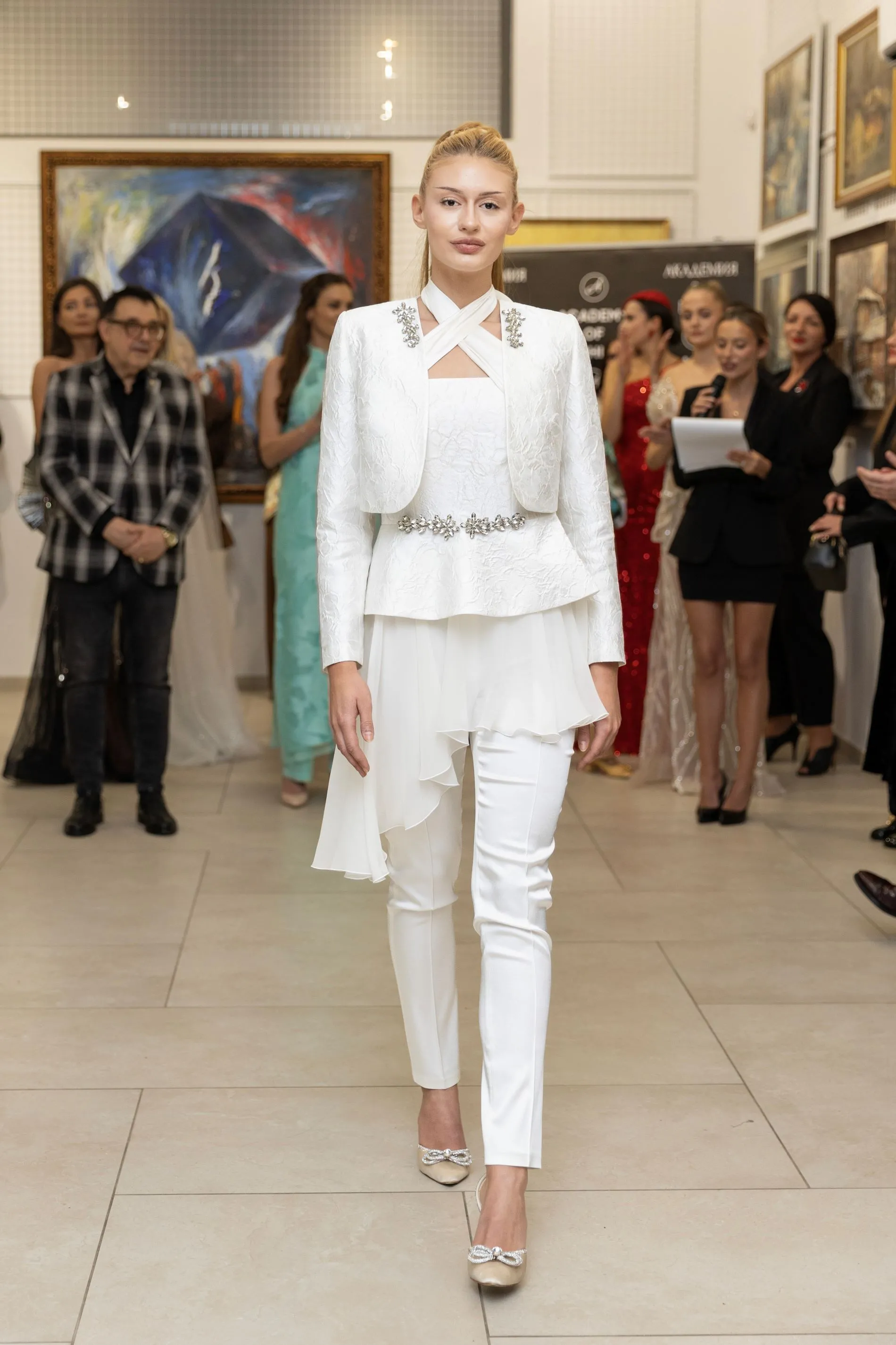 Модното ревю започна с Ивет Бианки – носител на „Златна игла 2024“ в категория „Най-добър млад дизайнер“, която представи рокля, част от колекцията Une nuit à Cannes („Една нощ в Кан“). Аутфитът е вдъхновен от духа на стария Холивуд – от онзи неподправен блясък и изтънчена женственост, които никога не излизат от мода.