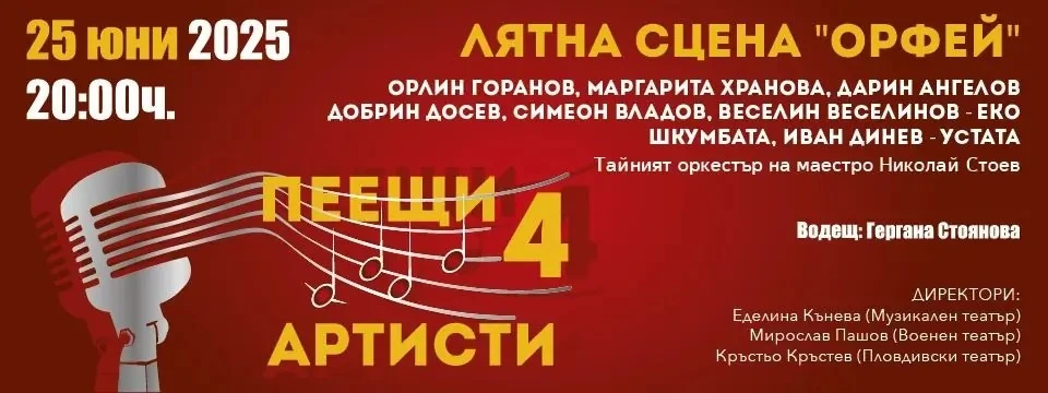 Явлението "Пеещи артисти" с концерт № 4 ще се приземи на 25 юни 2025 г. в Пловдив - от 20:00 ч. на лятна сцена "Орфей".