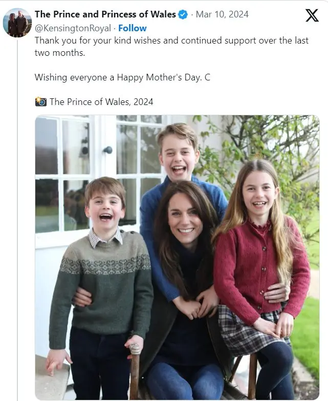 Въпросната фотография беше публикувана по случай Деня на майката и показва Кейт, заобиколена от нейните трите деца - принц Джордж, принцеса Шарлот и принц Луи. Твърди се, че снимката е направена от престолонаследника принц Уилям.