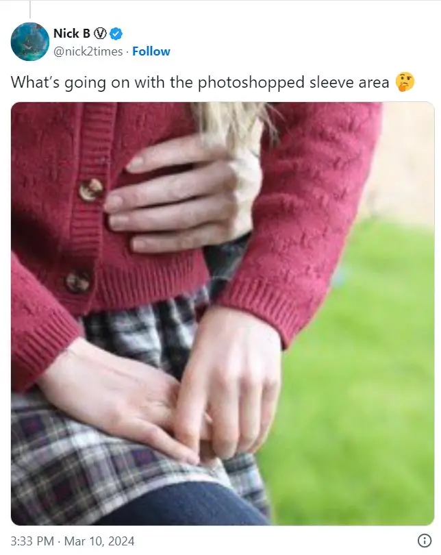 „Асошиейтед прес първоначално публикува снимката, която беше подадена от двореца Кенсингтън. АП по-късно оттегли изображението, тъй като при по-внимателно разглеждане изглежда, че източникът е манипулирал изображението по начин, който не отговарят на стандартите за снимки на агенцията".