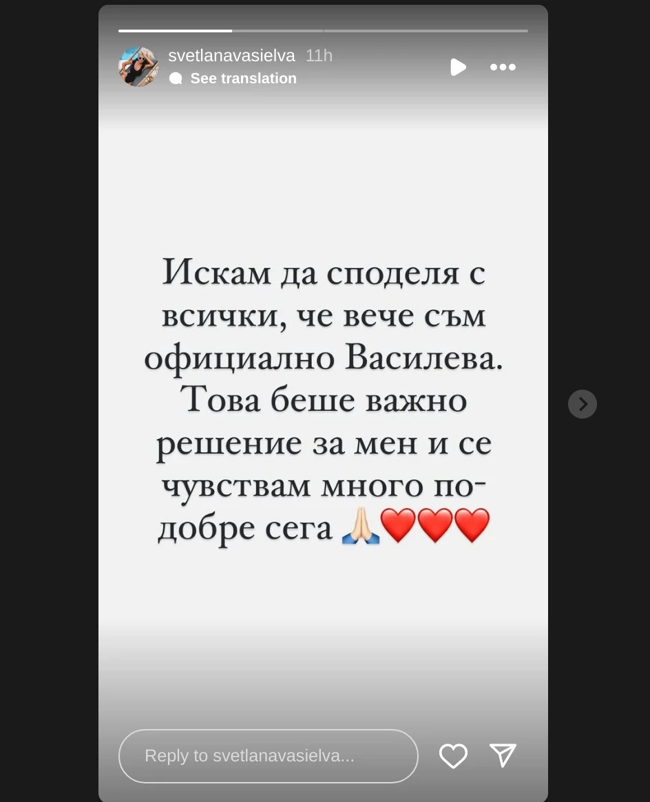 "Искам да споделя с всички, че вече съм официално Василева. Това беше важно решение за мен и се чувствам много по-добре сега", написа блондинката.