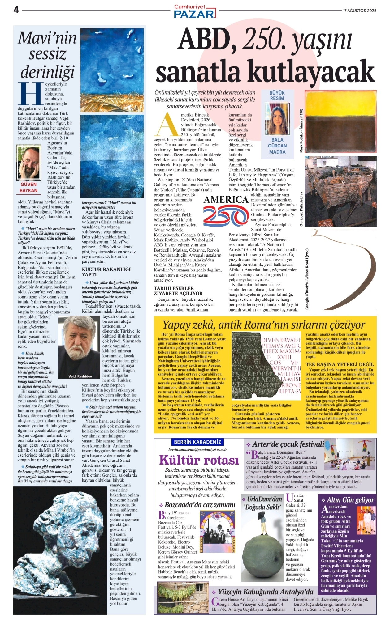 Публикация днес във в. „Джумхюриет“ разказва за успеха на изложбата на Вежди Рашидов в Бодрум. Авторът споделя как се е родила идеята за акварелите в синьо, както и за скулптурите, представени в една от най-хубавите зали на брега на Егейско море.