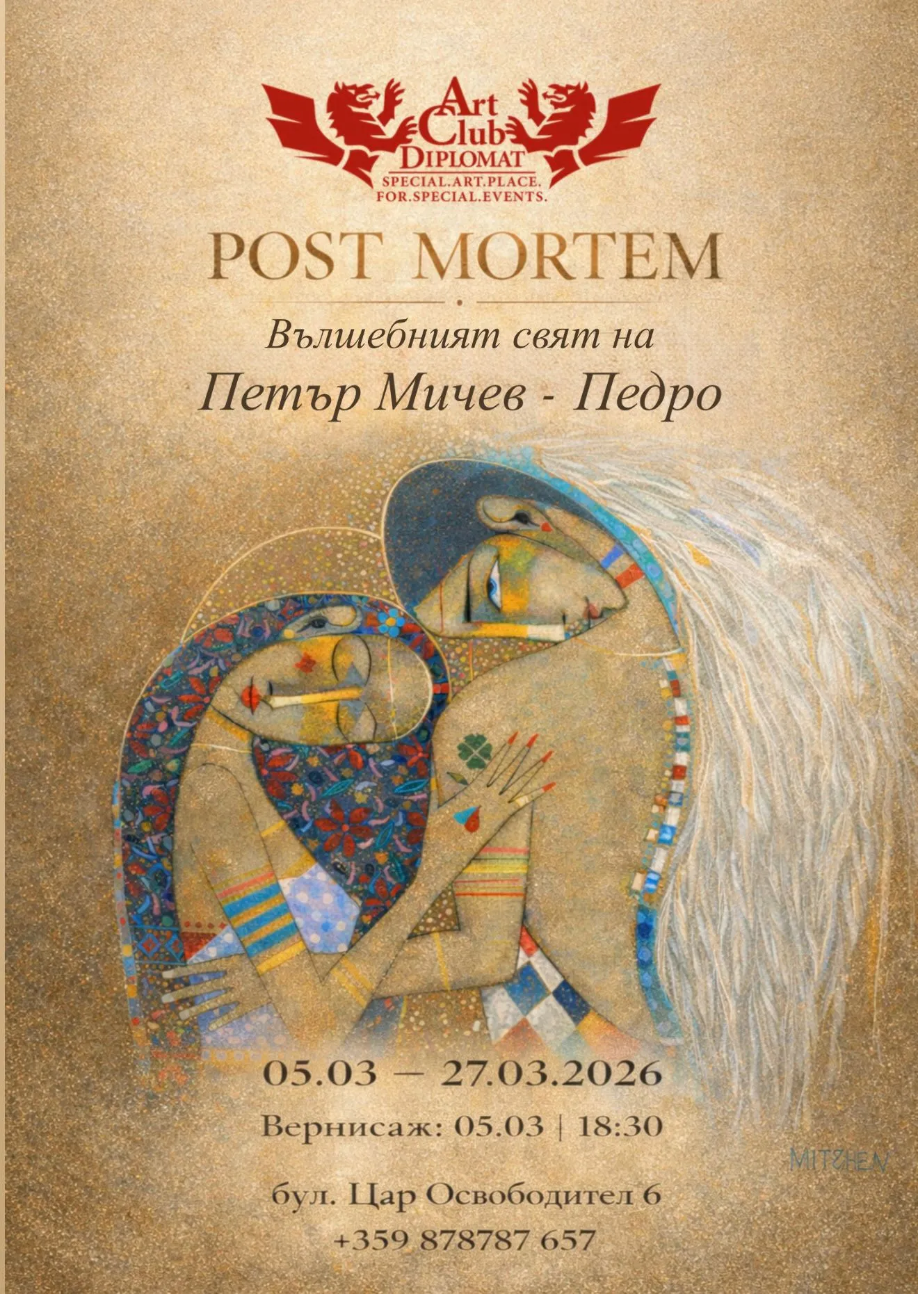 Изложба на Петър Мичев-Педро в Арт клуб „Дипломат“ ще възроди духа на прочутия художник близо две години след смъртта му. Престижната галерия на „Цар Освободител“ 6 остава вярна на традицията си да отдава почит на големите артисти в съвременното ни изкуство. Творбите в експозицията „Вълшебният свят на Петър Мичев-Педро“, която ще бъде открита на 5 март, ще пленят публиката с деликатните си образи, създадени с изключителен финес и палитра без аналог. Темата в тях е вечна – любовта и жената като нейна жрица. В платната кипят и прекипяват страсти. „Те са мистични и невъзможни за дефинирани“, както пишат френски критици през 90-те години.