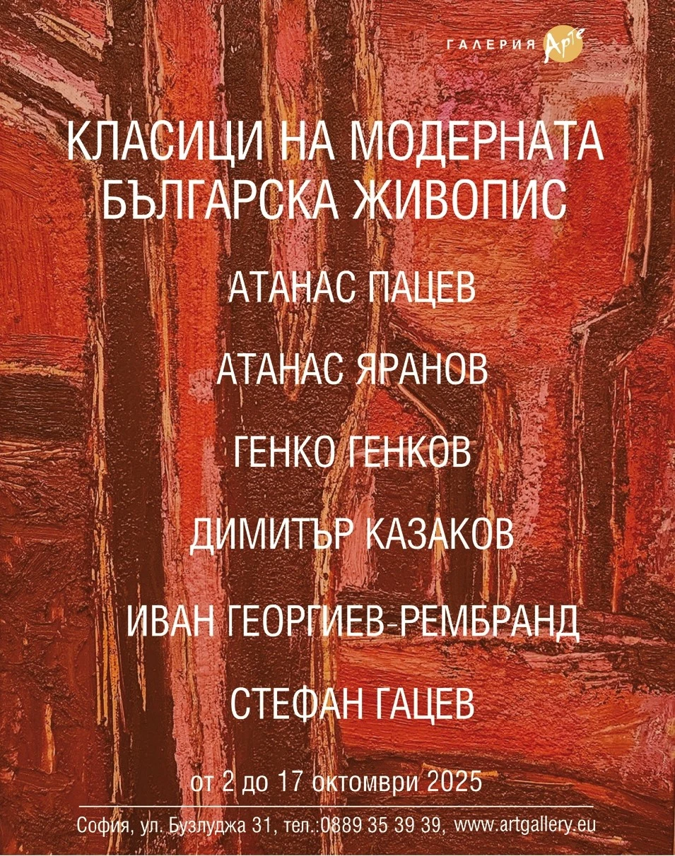 От 2 до 17 октомври столичната галерия „Арте“ ни предоставя невероятната възможност да се докоснем до изкуството на едни от емблемите на модерната българска живопис - Атанас Пацев, Атанас Яранов, Генко Генков, Димитър Казаков, Иван Георгиев–Рембранд, Стефан Гацев.