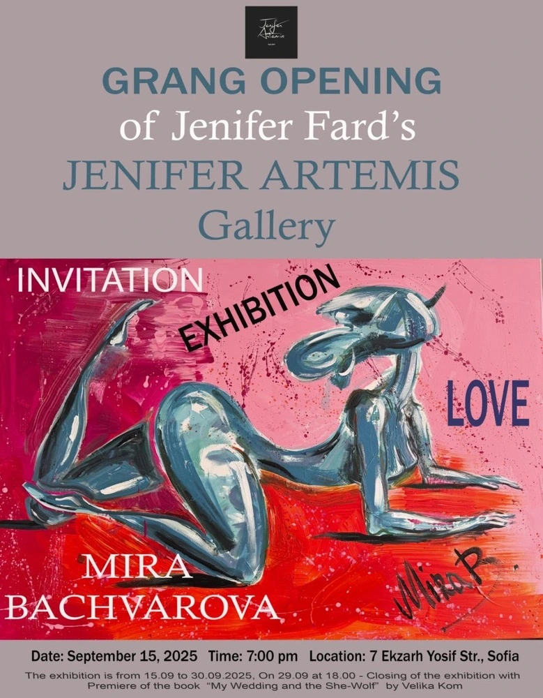 В София ще бъде открито ново арт пространство - галерия „Дженифер Артемис“, проект на Дженифер Фард. Премиерата е днес, 15 септември в 19:00 часа, а първата изложба в галерията е на художничката и дизайнерка Мира Бъчварова, съобщават организаторите.