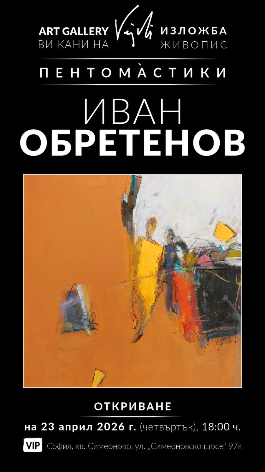 В модерното вип арт пространство на ул. „Симеоновско шосе“ 97 к в София ще бъдат показани 18 живописни платна, рисувани специално за изложбата. Поканата на арт галерия Vejdi за тази експозиция вдъхнови Иван Обретенов за цветните видения, които той нарече „Пентома́стики“.