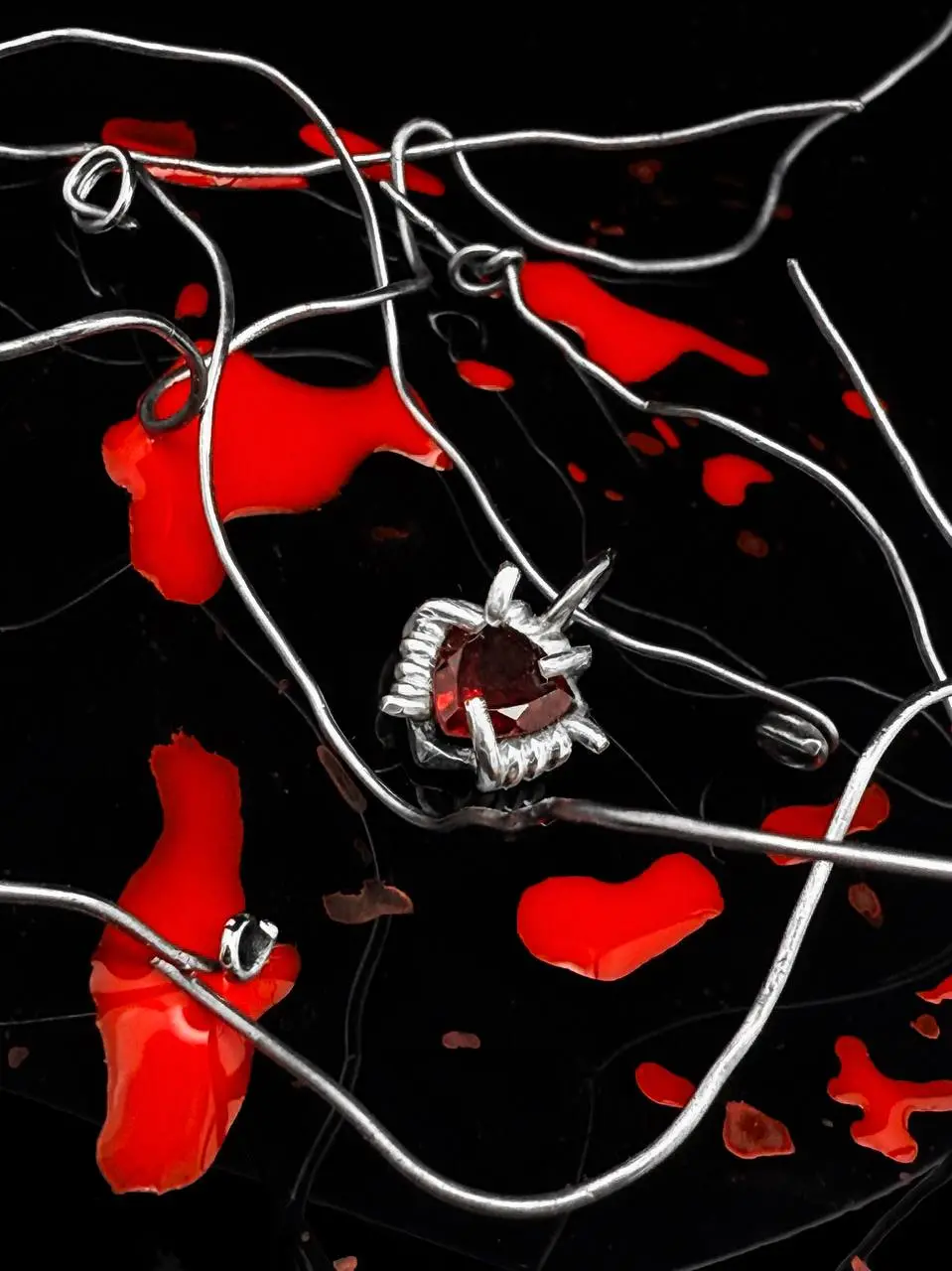 В „BARBWIRE BOUND“ Йоан монтира скъпоценни камъни върху бодлива тел – мощна метафора за връзката между защита и болка, която преплита възлите на любовта.