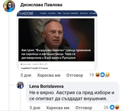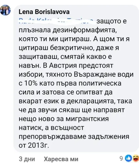 Подобен дебат се разгоря и на стената на Лена Бориславова, като част от усъмнилите се какво точно са подписали нашите управляващи, бяха дори симпатизанти на ПП, които г-жа Бориславова опита да убеди, че т.к. в Австрия предстоят избори, техните властници внушават, че са намерили начин да се отърват от хиляди афганистанци и сирийци (отговорни за огромна част от тежките престъпления там).