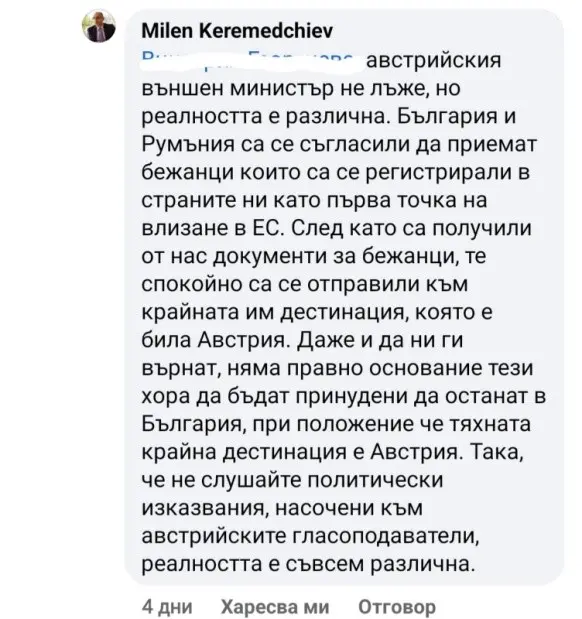 Нямаше как да не направи впечатление, че явно и голяма част от активистите и членовете на ПП например, явно не знаят какво точно сме обещали и подписали. Бившият зам.-вътрешен министър Милен Керемедчиев влезе в дебат във Фейсбук, като се опита да убеди опониращите го, че хем австрийският външен министър не лъжел, че сме се съгласили да приемем повече бежанци, конкретно афганистанци и сирийци, хем дори да ни ги върнат, тези хора не искали да останат у нас, нещо повече – думите на Герхард Карнер били насочени към неговите гласоподаватели, съответно били политическо изказване (явно все пак Карнер лъже).