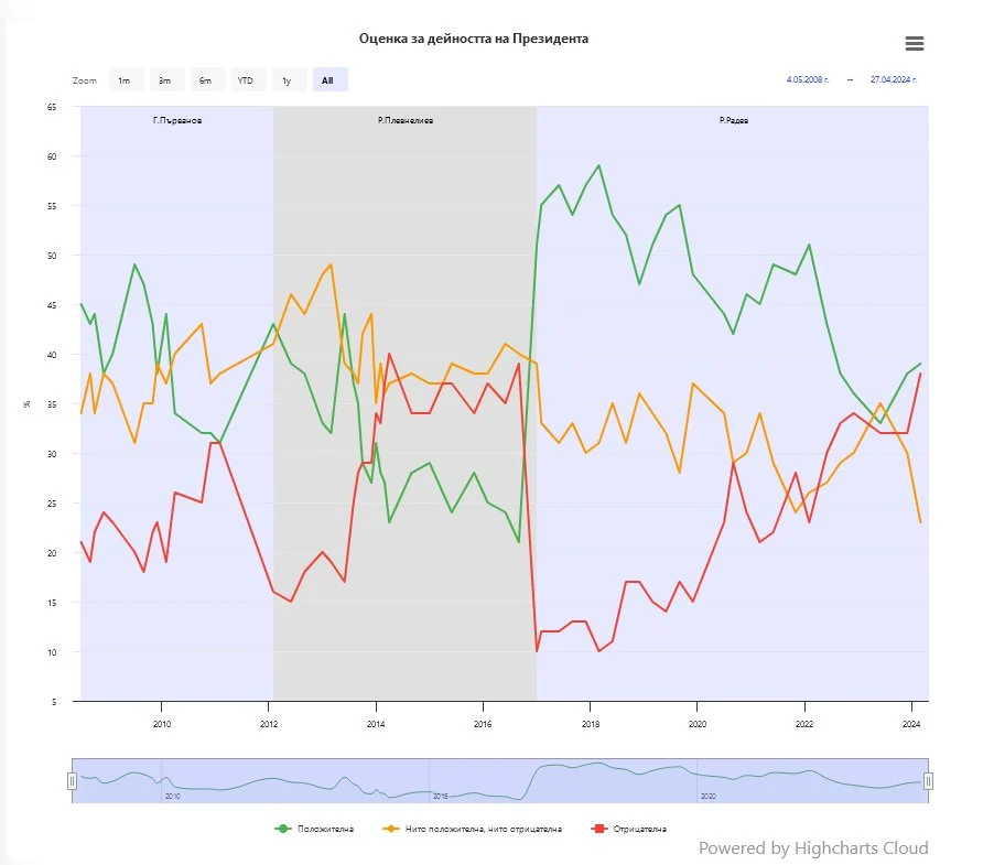 Сега нататък - Румен Радев. Неговата графика като интензивност е подобна на Борисовата - светкавични промени, нагоре-надолу, т.е. българинът внимава какво прави Радев, подобно на какво прави Борисов, но, да уточня, с Радев внимава малко по-малко, смятайки също, че го е опознал, но Радев си е от категорията на Борисов като обществено внимание.