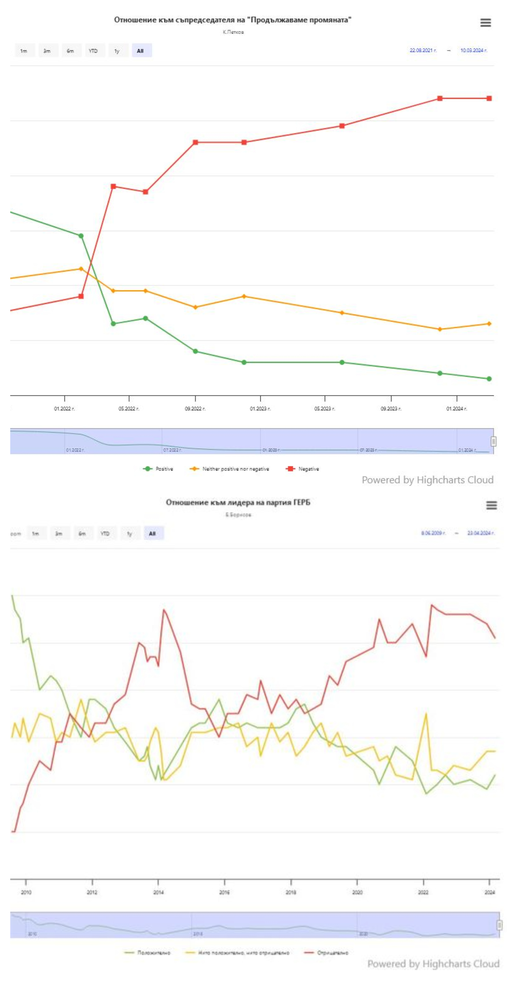 Графиките са от сайта на „Алфа рисърч“. Да обърнем внимание на първите две от тях, за да си онагледя наблюдението. Първата е на ППДБ лидера К. Петков. Втората е на Борисов.