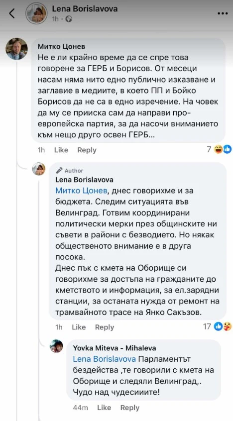 Запознати споделят, че в остатъка от решаващия ден преди поредния вот за избор на председател на парламента, Кирил Петков се е занимавал и с други важни дела – като да блокира заповедта на кмета на ППДБ на столичен район за събаряне на незаконни и опасни постройки в „Красна поляна“… Между пиене на кафе в кметски кабинети Лена Бориславова все пак намери време да заяви в статус във Фейсбук, че те с Борисов няма да се срещат… не че някой ги е канил. Коментарите под публикацията на напористата госпожа са показателни: