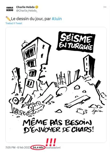 Земетръсната рисунка на „Шарли ебдо“ дори не е смешна, въпреки че вестникът претендира да произвежда смешки. Кое му е смешното? Не мога да разбера. Природна стихия за секунди прекършва живота на хиляди невинни хора. Е, може и да не са били невинни, може да плащат за някакви свои грехове, но това не е работа на „Шарли ебдо“, нито по някакъв начин е смешно.