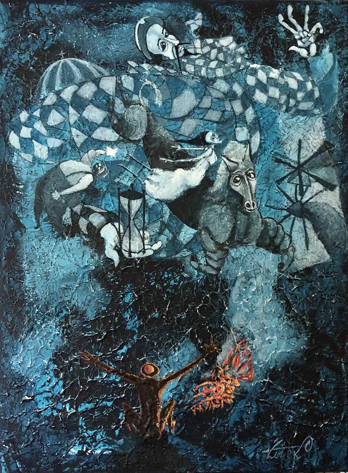 - Ами то всъщност е едно и също лице, при мен художник все още няма. Все още творецът е самият актьор, който е завършил „Кукли“ и има доста умения от гледна точка на боравенето с различни материали, чисто технически. Оттам нататък въображението и структурирането на самите картини аз лично правя по театрален начин. Както бих разсъждавал, анализирал, поставил една сцена или един епизод от едно произведение, по същия начин работя и върху картината. В момента, в който имам идея в главата за дадена картина, аз започвам да я структурирам и започвам да разсъждавам върху нея по чисто театрален начин. Театрален анализ правя, няма какво да се залъгваме. Моите картини наистина продължават да си бъдат театрални и смятам, че те ще си останат при мен такива. Няма значение как ще променям техниката или стила си, просто те ще си останат театрални, за което пък съм щастлив, благодарен съм на съдбата, че мога да използвам онова, което съм учил през живота си, защото това е страхотно!
