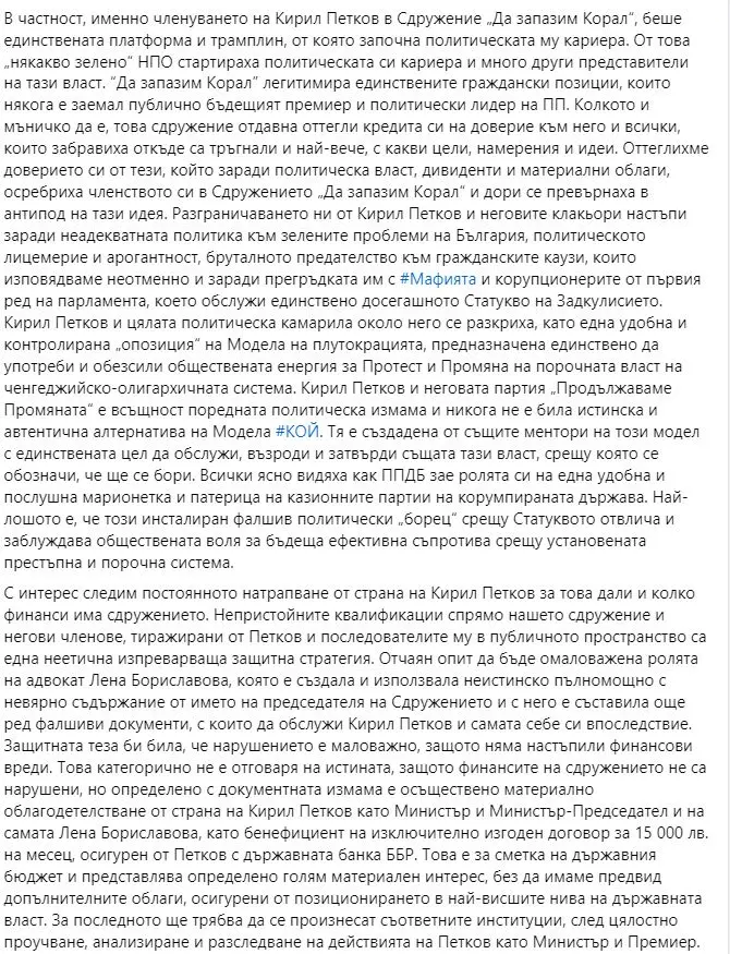 „В частност, именно членуването на Кирил Петков в Сдружение „Да запазим Корал“, беше единствената платформа и трамплин, от която започна политическата му кариера. От това „някакво зелено“ НПО стартираха политическата си кариера и много други представители на тази власт„Да запазим Корал” легитимира единствените граждански позиции, които някога е заемал публично бъдещият премиер и политически лидер на ПП. Колкото и мъничко да е, това сдружение отдавна оттегли кредита си на доверие към него и всички, които забравиха откъде са тръгнали и най-вече, с какви цели, намерения и идеи. Оттеглихме доверието си от тези, който заради политическа власт, дивиденти и материални облаги, осребриха членството си в Сдружението „Да запазим Корал“ и дори се превърнаха в антипод на тази идея“, заявяват още те.