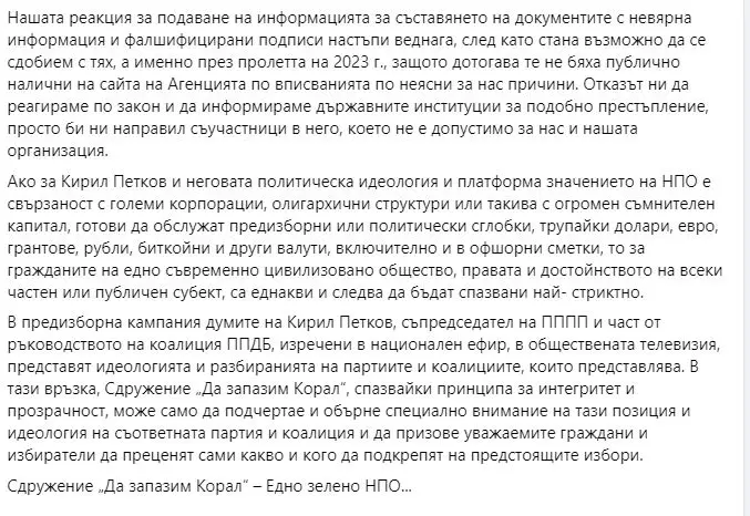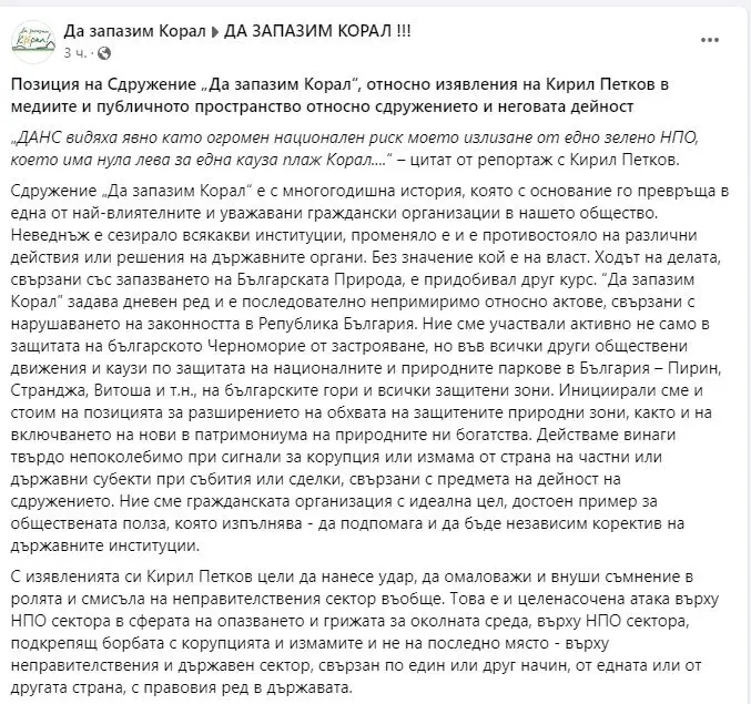 Неправителствената организация „Да запазим Корал“ излязоха с позиция във Фейсбук страницата си по повод думите на Кирил Петков в медиите и публичното пространство относно сдружението и неговата дейност