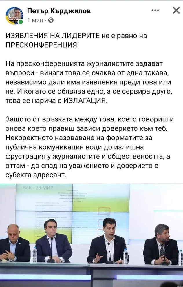 Когато се обявява пресконференция, това предполага отговори на журналистически въпроси. Когато не допускаш журналистически въпроси, това означава, че не допускаш въпроси на обществото. А когато искаш да дадеш изявление, не го обявяваш за пресконференция, а или пускаш прессъобщение с позицията си до медиите и в информационните си канали, или си го излъчваш сам. Всичко останало събужда неприятни размисли. Силно се надявам, че грешката е неволно комуникационна и леко непрофесионална.