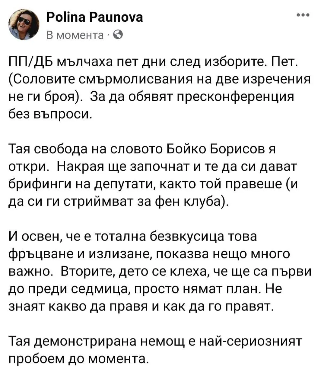 Оф, гледах пресконференцията на ПП/ДБ. Наистина Кирил Петков им разгонва фамилията. Тотален палячо! От пресконференцията разбирам, че сюжетът от миналите избори ще се повтори в абсолютно същия сценарий и по същия ред. „Има разделение на властите в страната“ и затова нямало да подкрепят Борисов, изказа се Атанасов. От всичко става ясно, че ПП/ДБ отново казват: няма да подкрепим ГЕРБ, но искаме ГЕРБ да ни подкрепи при това без каквото и да е участие.
