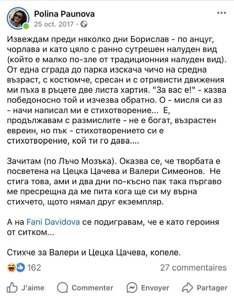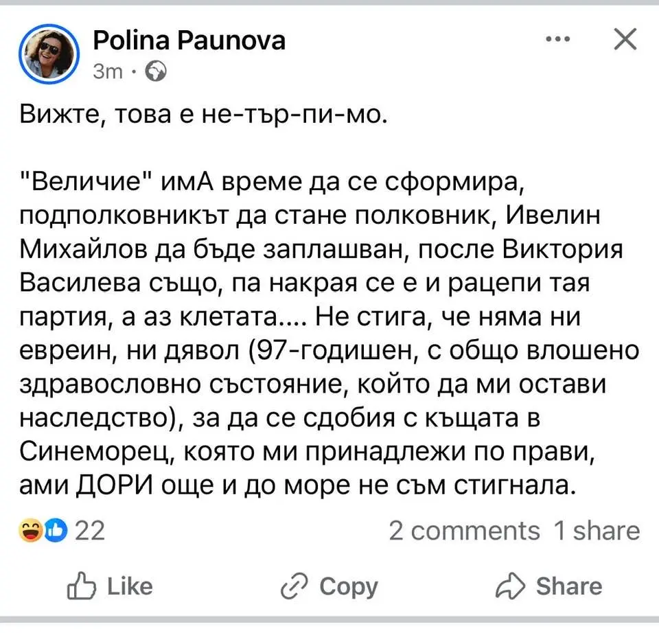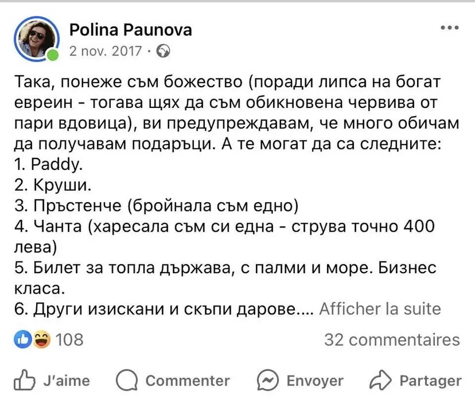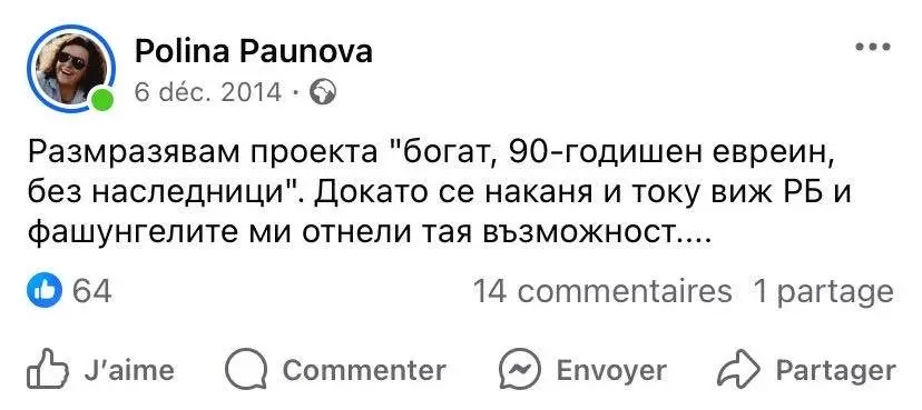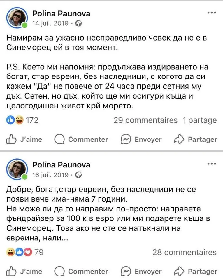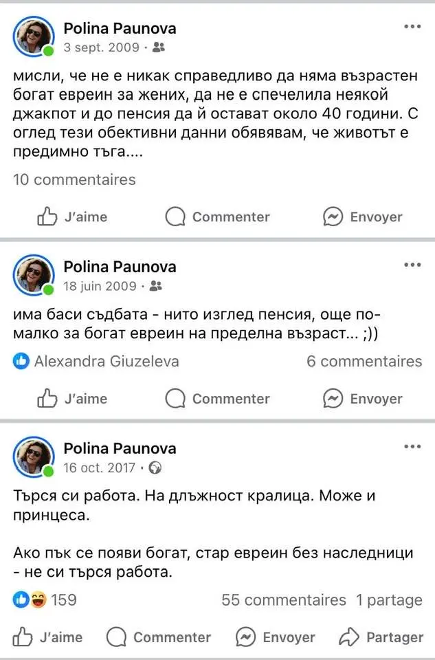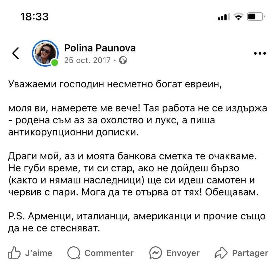 Когато, вчера, споделих с възмущение антисемитската шега на журналистката Полина Паунова, вярвайки, че тя не осъзнава какво точно е написала, не допусках, че тя използва подобен хумор от повече от 15 години.
