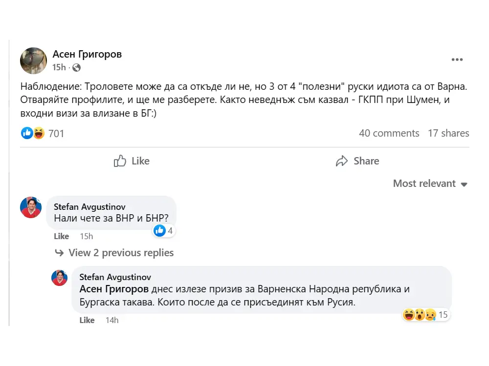 Под поста на Григоров се коментира и идея за Варненска Народна република и Бургаска Народна република, които после да се присъединят към Русия….
