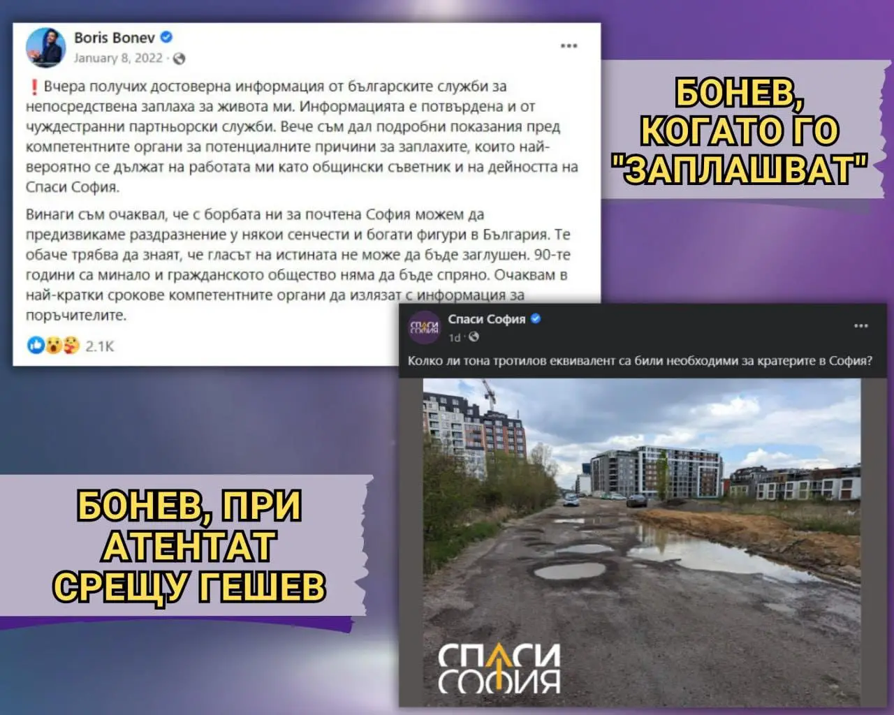 Днес обаче, когато бе извършен атентат срещу главния прокурор Иван Гешев, съпругата и двете му деца, на същия Бонев му е изключително смешно. Общинският съветник от „Спаси София“ не вижда нищо страшно в това да гръмне бомба до колата на обвинител номер 1, която едва не уби него и семейството му. Напротив, Бонев се забавлява като пуска изключително неуместни шеги и сравнения с дупки по улиците, които да осмеят иначе нечувания опит за покушение срещу главния прокурор на България, независимо кой е той и как се казва.