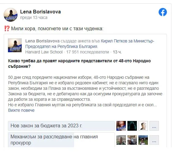FaceBook Twitter Pinterest https://tribune.bg/bg/mrezhata/borislavova-s-anketa-anketira-vav-feysbuk-kakvo-tryabva-da-raboti-ns/