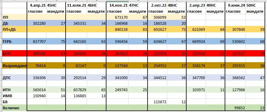 Всеки анализ трабва да почива не просто на емоции, а преди всичко на числа. Затова качвам тук резултатите от всички избори от април 2021 до онзи ден - в брой гласове и брой мандати в последните 6 парламента.
