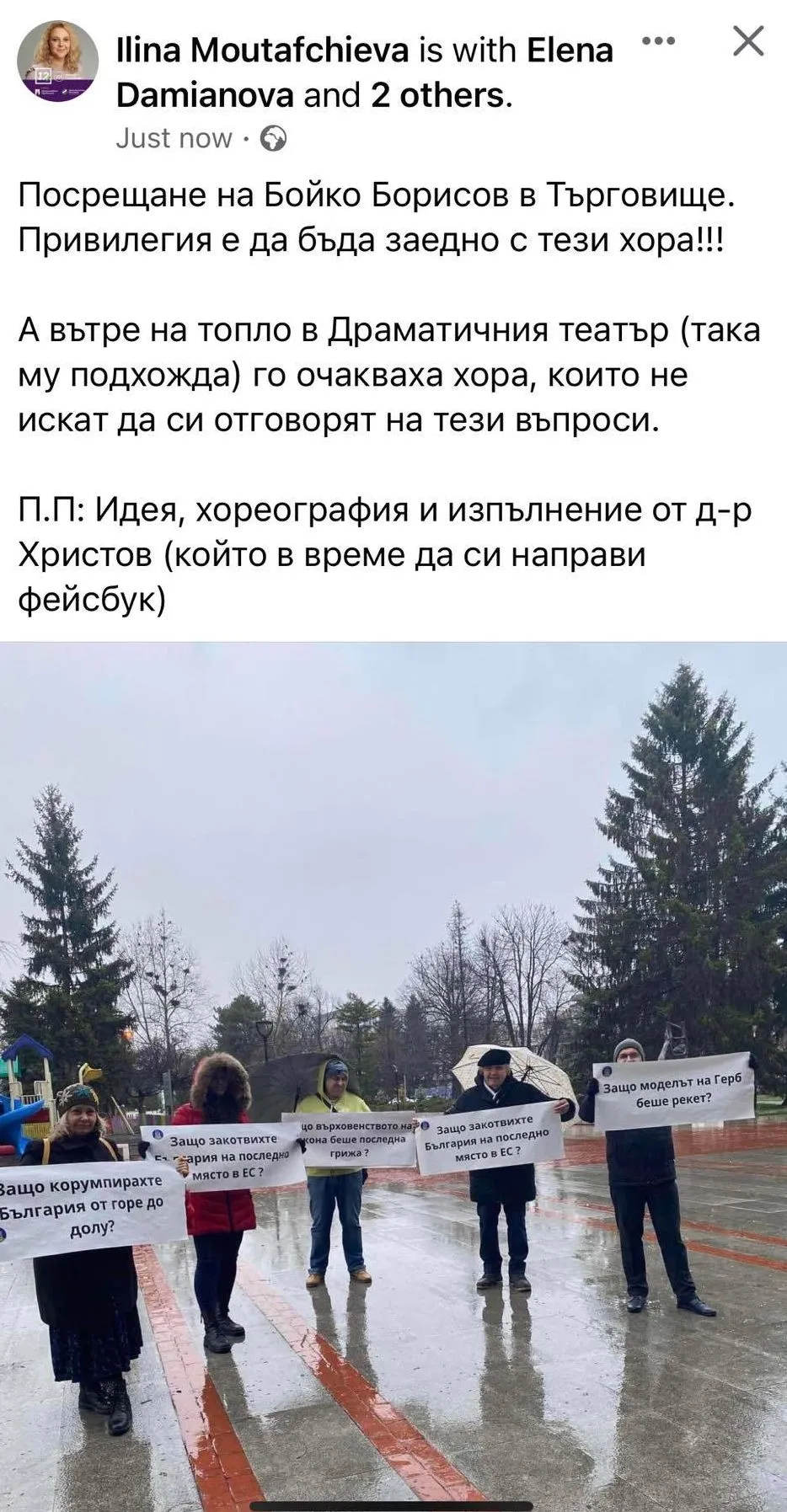 За „масовия протест“ съобщиха първо пиарите Никола Николов и Севделина Арнаудова, които дори им дали чадъри.