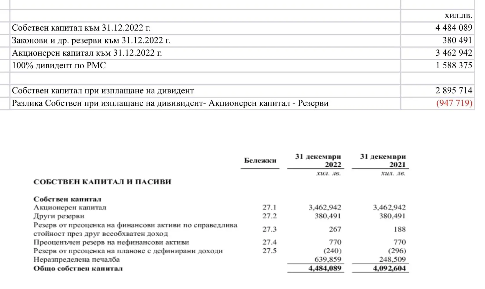 Тоест, ако БЕХ изпълни решението на МС да изплати 1 588 375 000 лева дивидент, от собствения капитал към 31.12.2022 трябва да извадим планирания дивидент, акционерния капитал и резервите. Резултатът трябва да е положителна величина. Да, ама не. Резултатът е отрицателен и то в размер на близо 1 млрд лева (виж таблицата).
