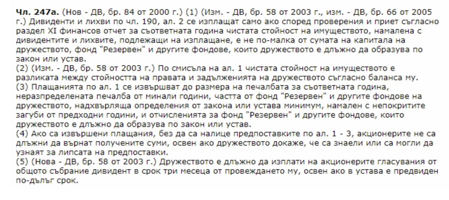 Съгласно чл. 247а от Търговския закон, дивиденти и лихви се изплащат само ако чистата стойност на имуществото, намалена с дивидентите и лихвите, е не по-малка от сумата на капитала на дружеството, фонд "Резервен" и другите фондове, които дружеството е длъжно да образува по закон или устав.