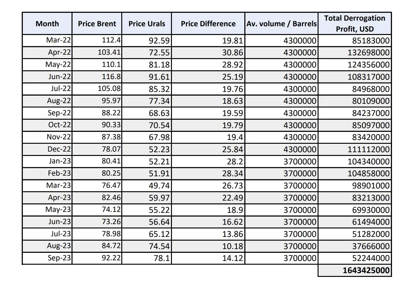 От началото на войната в Украйна и санкциите към Русия, руският петрол започна да се търгува много по-евтино от останалия петрол. Руският петрол е сорт Urals и неговата цена по месеци е нанесена в третата колонка. Във втората колонка е цената на петрол сорт Brent, който купуват останалите държави. В четвъртата колонка е разликата в цената между брента и руския уралски нефт в американски долари за един барел. За първия месец например е 19.81 на барел за месец март 2022 година. В петата колонка е средния обем барели за 2022 и 2023, които е купувал Лукойл.