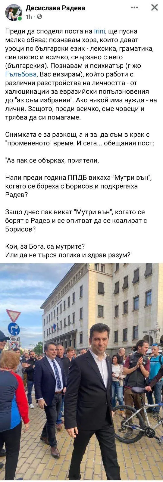 Съпругата на Румен Радев препоръча психиатър на ПП и протестиращи срещу Румен Радев. Във фейсбук профила си тя пусна снимка на Кирил Петков, към който е написала: