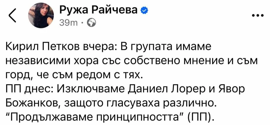 Първо, пълен срам е гласуването на ППДБ с Възраждане по въпроса за председател. Имам приятели в ДБ и ми се искаше да се придържат към принципната си позиция от последните дни. Тази легитимация на Възраждане ще ни изяде главата на всичките. ПП са ясни - те са фанатични в искането си да клатят държавата, но от ДБ се очаква повече. Не може ситуационния интерес да надскача дългосрочните цели пред страната.