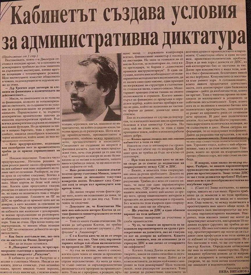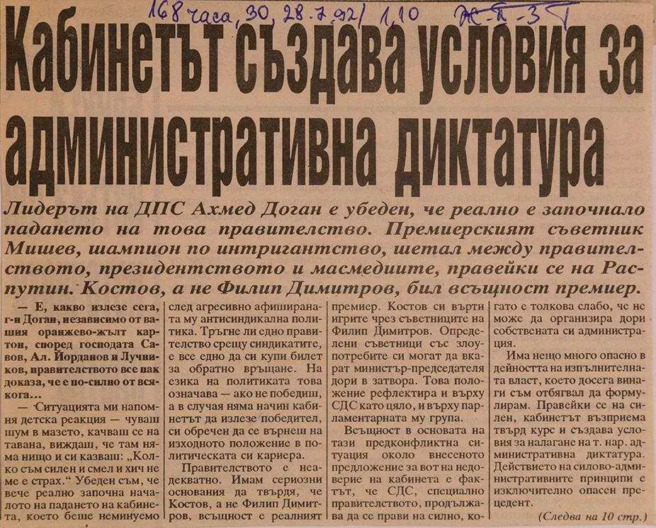 ДПС без офицери или доносници на Държавна сигурност в листите за народни представители! Това е революция. Когато започна войната на антикомунистите с Доган и ченгететата около него... дори не съм си мечтал за подобно нещо. Тук е важно да се знае, че тази война беше започната от Доган, а не от СДС. Това беше и моята лична война. Бях първият човек, свързан със СДС, който беше атакуван фронтално, цинично и грубо от Ахмед Доган. През лятото на 1992 година.