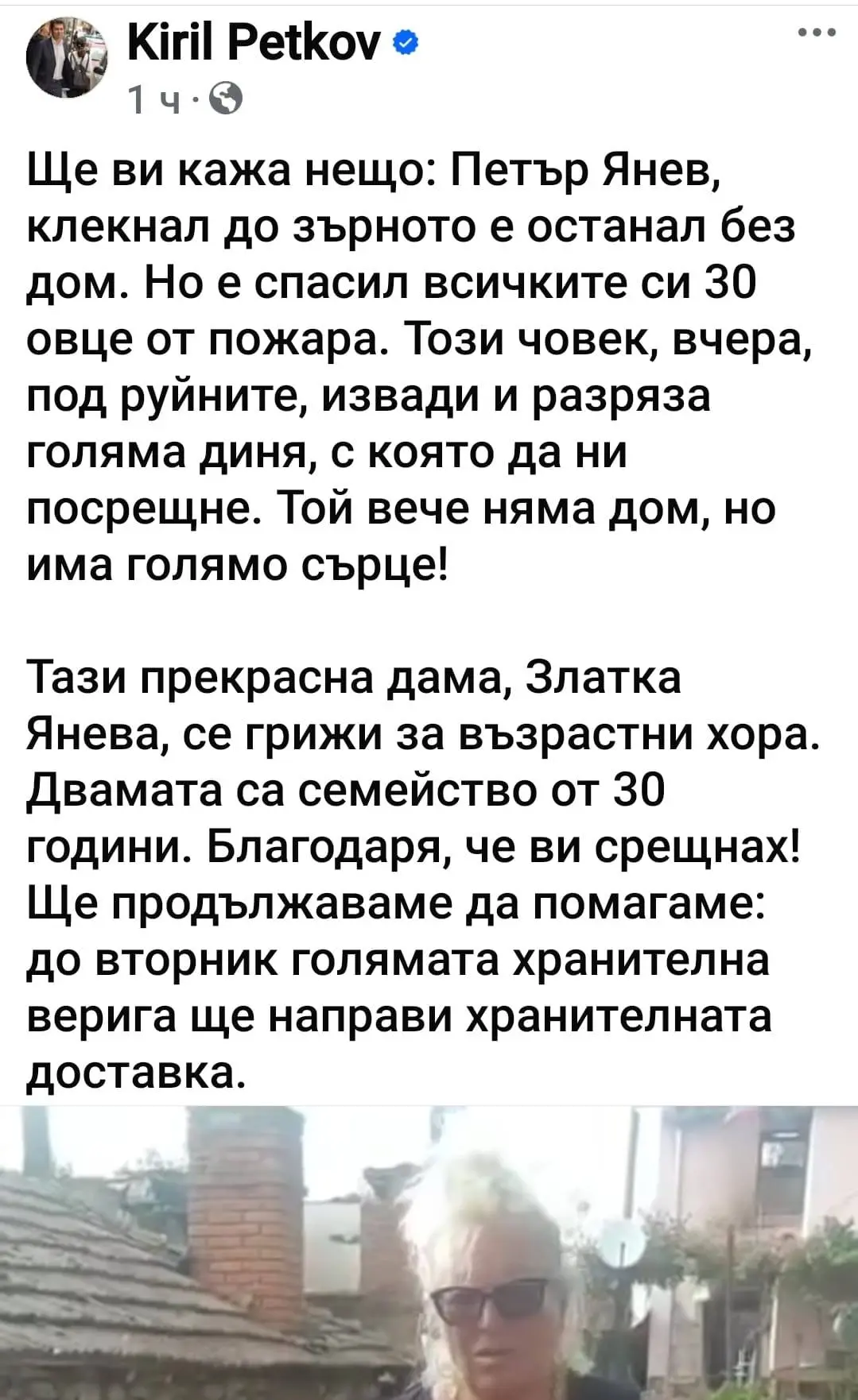 Златка Янева, която възхвалява в последните дни Кирил Петков забравила да евакуира възрастен човек при пожара и го заключила в дома. Наложило се полиция да разбива прозорците и да го спасява