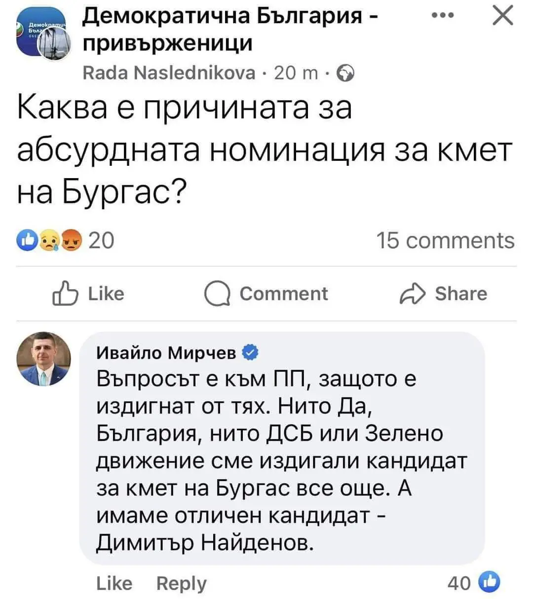 Новината, че ПП издига Константин Бачийски за кмет на Бургас разедини симпатизантите на коалицията ПП/ДБ. Ивайло Мирчев призна в социалните мрежи, че ДБ не са били потърсени за консултация по темата.