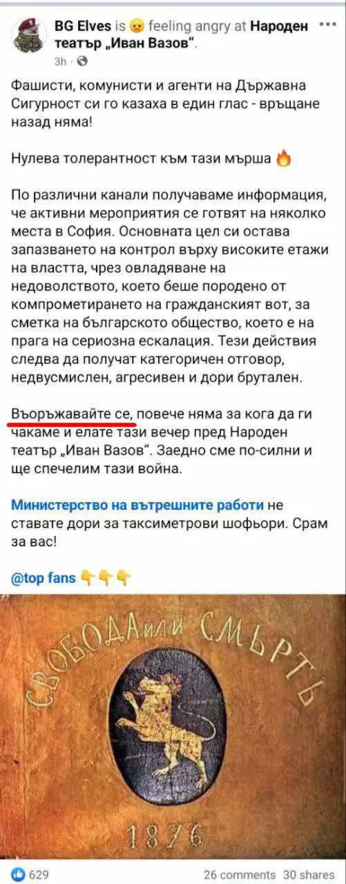 „Въоръжавайте се, повече няма за кога да ги чакаме и елате тази вечер пред Народен театър „Иван Вазов“. Заедно сме по-силни и ще спечелим тази война. Министерство на вътрешните работи не ставате дори за таксиметрови шофьори. Срам за вас!“, пишат още „елфите“ на ППДБ.