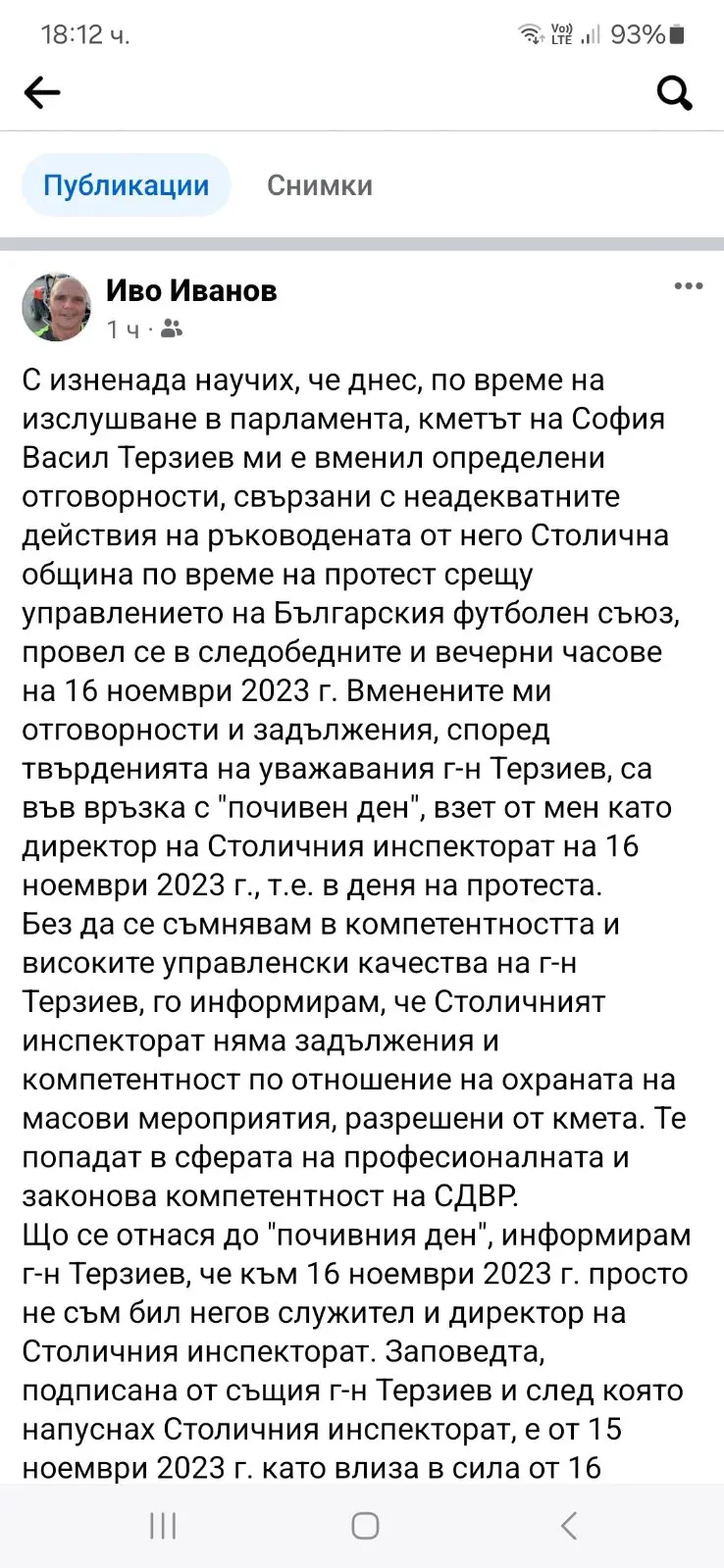 С изненада научих, че днес, по време на изслушване в парламента, кметът на София Васил Терзиев ми е вменил определени отговорности, свързани с неадекватните действия на ръководената от него Столична община по време на протест срещу управлението на Българския футболен съюз, провел се в следобедните и вечерни часове на 16 ноември 2023 г. Вменените ми отговорности и задължения, според твърденията на уважавания г-н Терзиев, са във връзка с "почивен ден", взет от мен като директор на Столичния инспекторат на 16 ноември 2023 г., т.е. в деня на протеста.