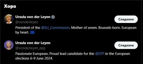 Потребителят обаче не отчита факта, че Урсула фон дер Лайен е представена в бившата мрежа Туитър /сега X/ веднъж като председател на ЕК – какъвто е именно от 2019 г. и където се показва работата и визитите ѝ – и втори път като кандидат за нов мандат начело на ЕК. Това е с цел да не се смесват кампанията и работата ѝ в Еврокомисията. Трябва да се подчертае, че Урсула фон дер Лайен пристигна в Пловдив не само за да даде подкрепа за ГЕРБ, но и за потърси такава за кампанията си за нов мандат. А посещението ѝ в града под тепетата беше третото в държава членка от избирането ѝ за водещ кандидат на конгреса на ЕНП в Букурещ през март. Първите бяха в Атина и Рим.