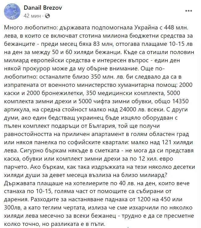 Много любопитно: държавата подпомогнала Украйна с 448 млн. лева, в които се включват стотина милиона бюджетни средства за бежанците - преди месец бяха 83 млн, оттогава плащаме 10-15 лв на ден за между 50 и 60 хиляди бежанци.