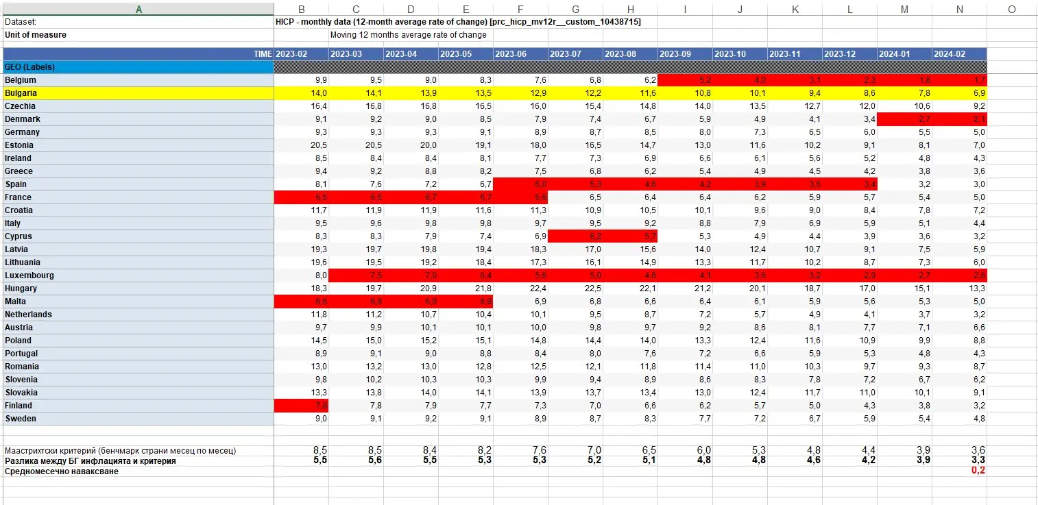 Всичко сме извадили с колегите: инфлация в ЕС по месеци, кои 3 държави са с най-ниска, каква е разликата между нашата инфлация и критерия за влизане в еврозоната, с каква средна скорост на месец се приближаваме до целта.