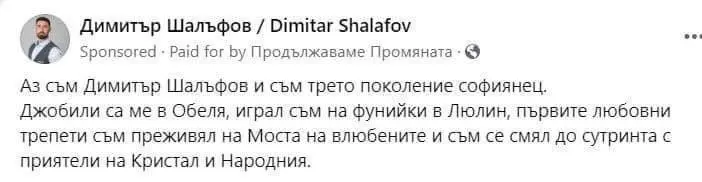 Във Фейсбук адвокатът се представя на избирателите като трето поколение софиянец. После искрено и лично споделя събития от различни квартали, белязали детството и тийнейджърството му.