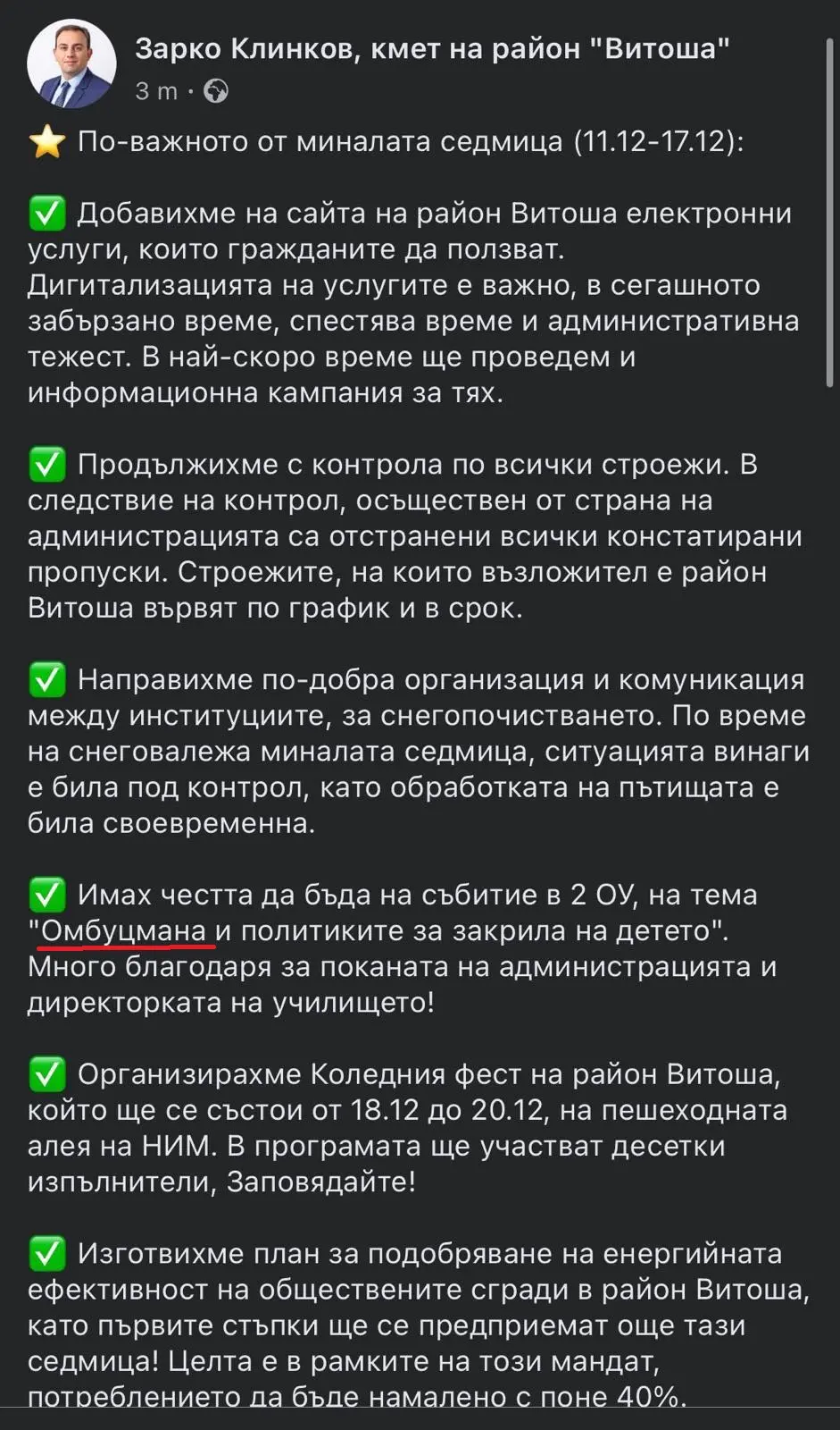 Кметът на район „Витоша“ от ПП-ДБ Зарко Клинков даде отчет за свършената работа през изминалата седмица. Някъде между почистването на клони и проверките на строежи, Клинков отчита и среща с „Омбуцмана“, вероятно имайки предвид Омбудсмана Диана Ковачева.