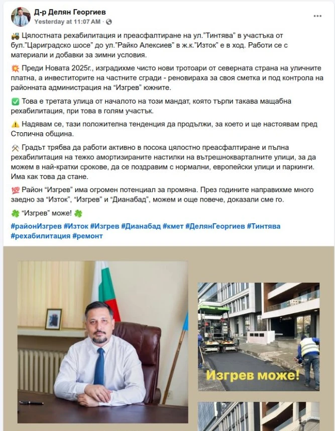 Районният кмет на Изгрев Д-р Делян Георгиев се похвали, че преасфалтира ул. Тинтява ... почти. От думите му ще решите, че е оправил поредната улица. В пространствено обяснение пише това за голям успех на районната община. Не уточнява обаче, че с публични средства е асфалтирал само пред новата сграда на Софиямед.